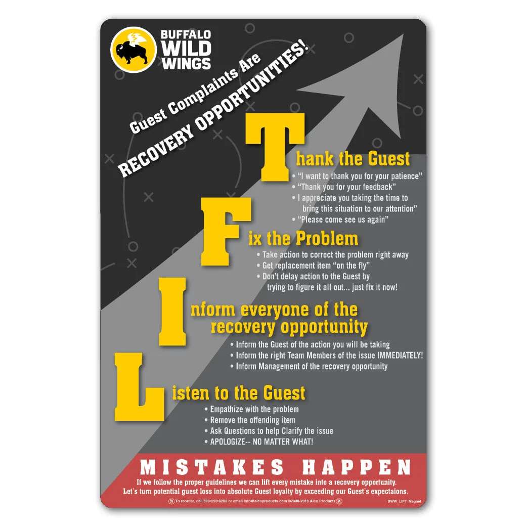 Designed while at Alco Products, this employee training poster for Buffalo Wild Wings reinforces a proactive customer service mindset. The bold typography, structured hierarchy, and strong visual direction ensure clarity and quick comprehension in a fast-paced environment. Displayed in over 1,200 locations nationwide.